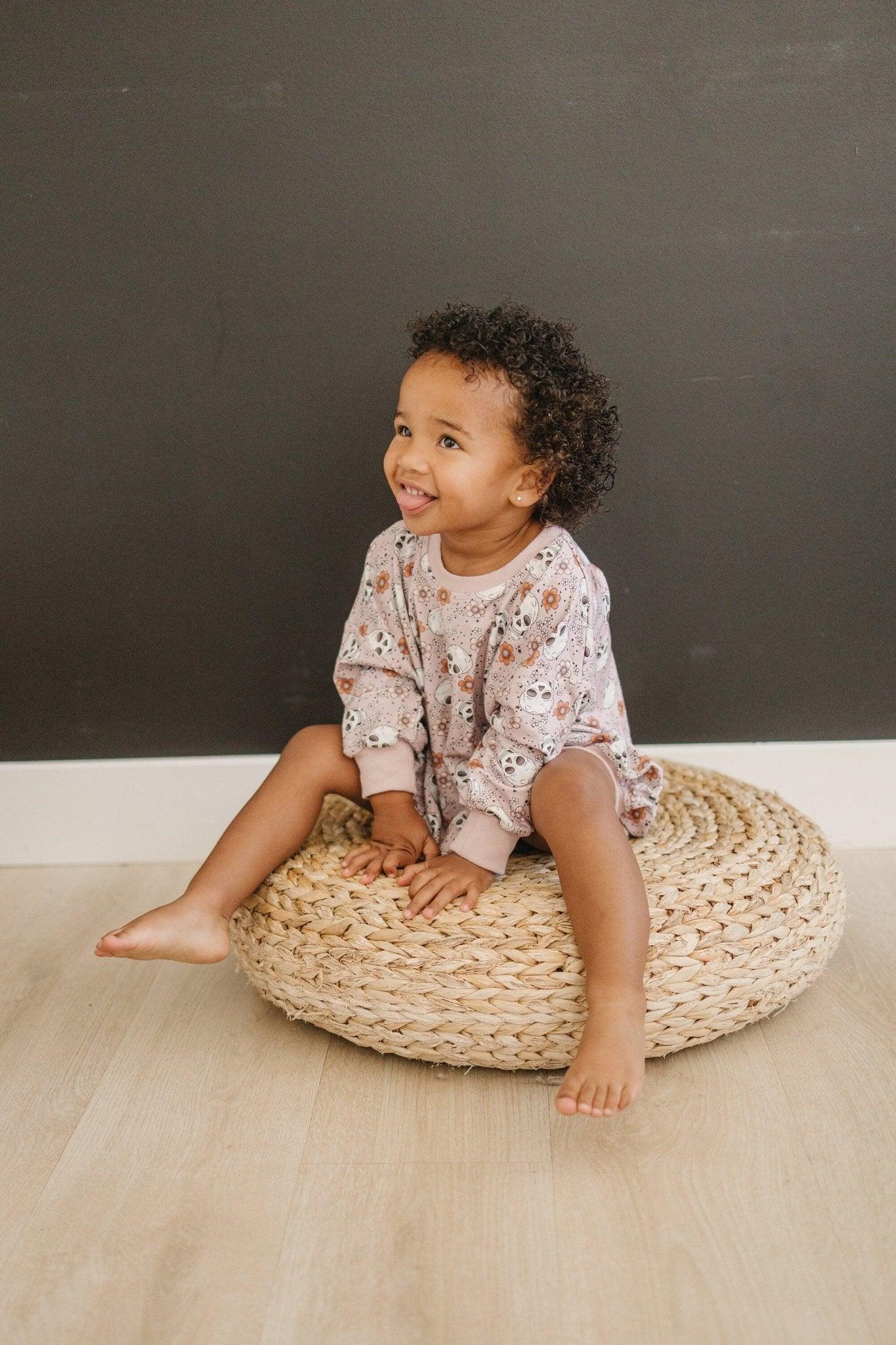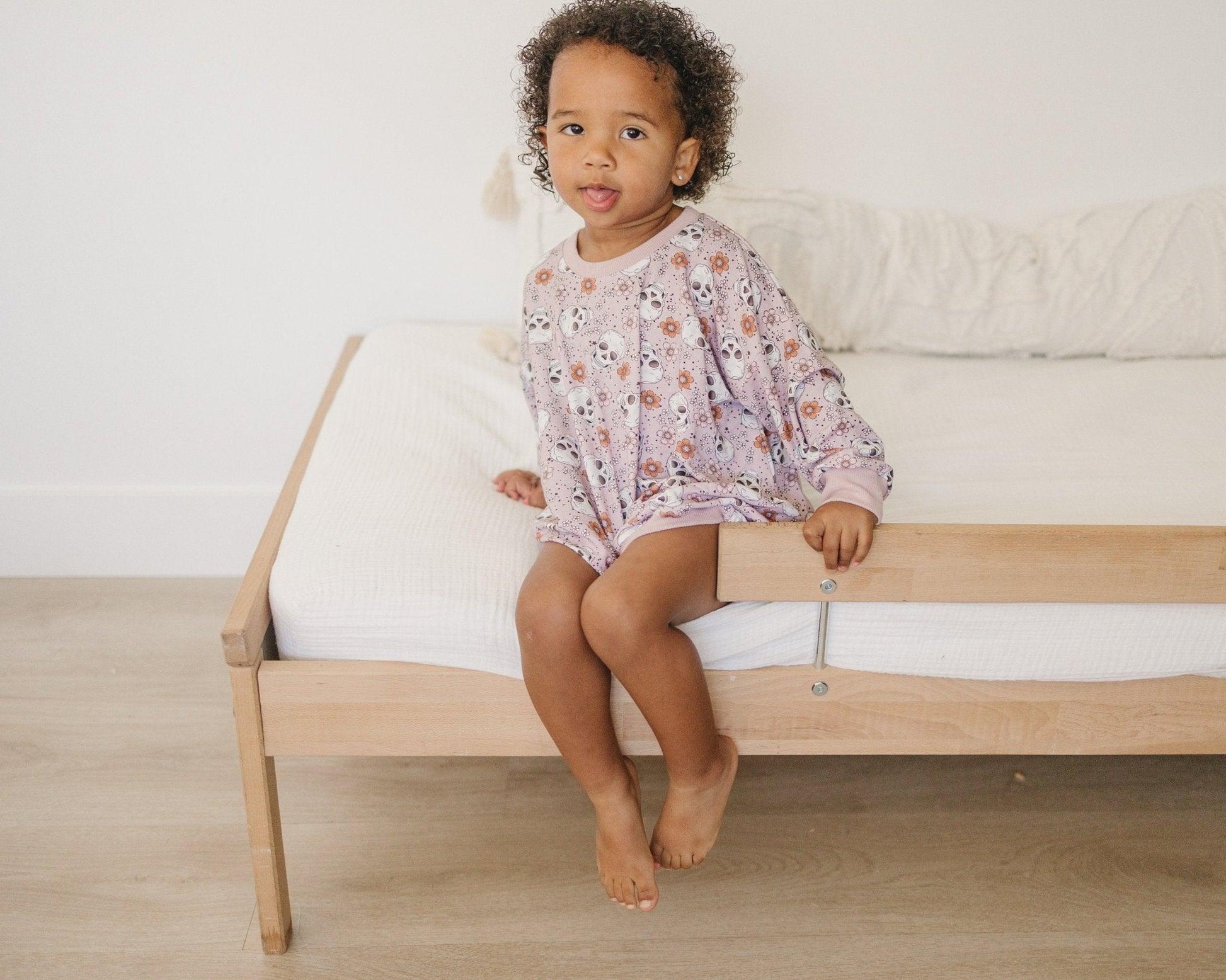 Elevate your child's comfort and style with the Purple Floral Skull Print Bamboo Bubble Romper. It's a versatile piece that merges quality, individuality, and comfort, ensuring your little one is both cozy and uniquely fashionable.