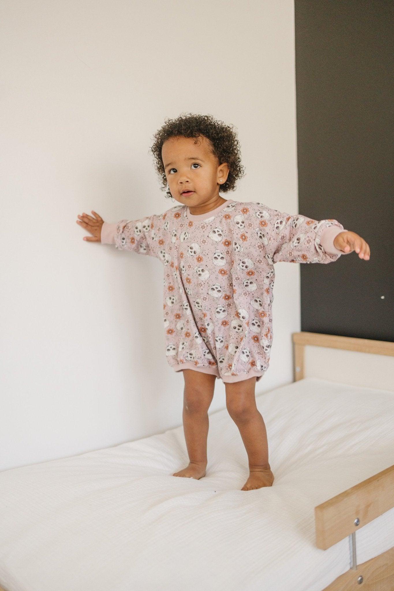 Available in sizes newborn to 2T, this romper is designed to grow with your child. The captivating purple floral skull print adds a distinctive flair, combining sweetness with a touch of rebelliousness.